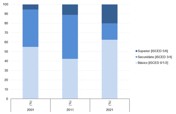 Gráfico 1 Nascidos em Portugal residentes em Espanha, segundo o nível de escolaridade, 2001-2021