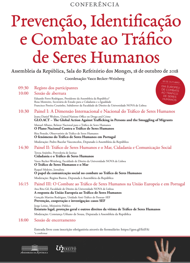 No próximo dia 18 de outubro, irá ter lugar na sala do Refeitório dos Monges, na Assembleia da República, a conferência “Prevençção, Identificação e Combate ao Tráfico de Seres Humanos”, a partir das 9h30.